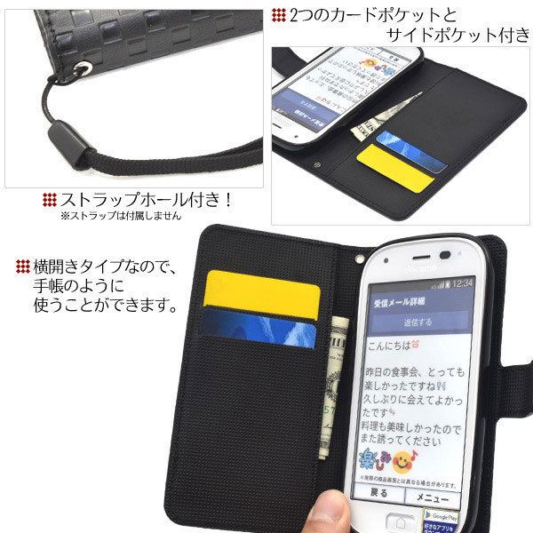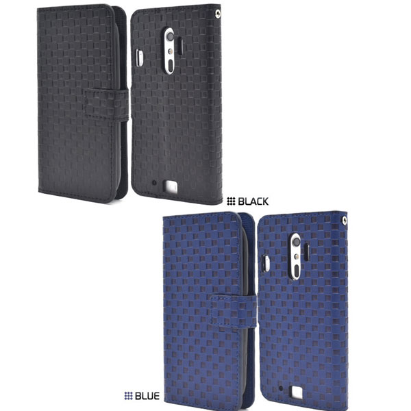 市松模様レザーデザインのらくらくスマートフォン4用スタンドケースポーチ。