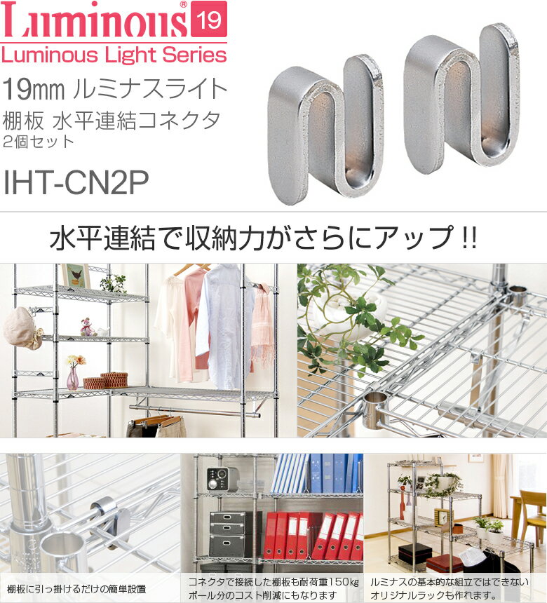商品シリーズ【19mm ポール】棚板 水平連結ジョイント ブランド19mm ルミナスパーツ(ラック拡張) 型番IHT-CN2P サイズモデルポール径 19mm/ モデル 適応・最適パーツサイズφ2.5×2.3cm 外形寸法φ2.5×2.3cm 素材スチール(クロームメッキ) 塗装・コーティング セット内容連結コネクター×2 梱包サイズ・重量(約)47×18×7.5cm/0.067kg JANコード4536863753365 同規格製品- 備考棚板を水平連結させることができる連結ジョイントパーツ 関連アイテム-