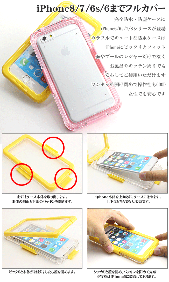 商品詳細 商品名:iPhone8 iPhone7 iPhone6s iPhone6 完全防水 防塵 耐衝撃 対応機種:iPhone8 iPhone7 iPhone6s iPhone6 素材 プラスチック、シリコン(タッチ面) サイズ 14mm×155×83 海水浴場やスキーで大活躍!完全防水ケースの登場!! 本体はプラスチック製で堅牢。